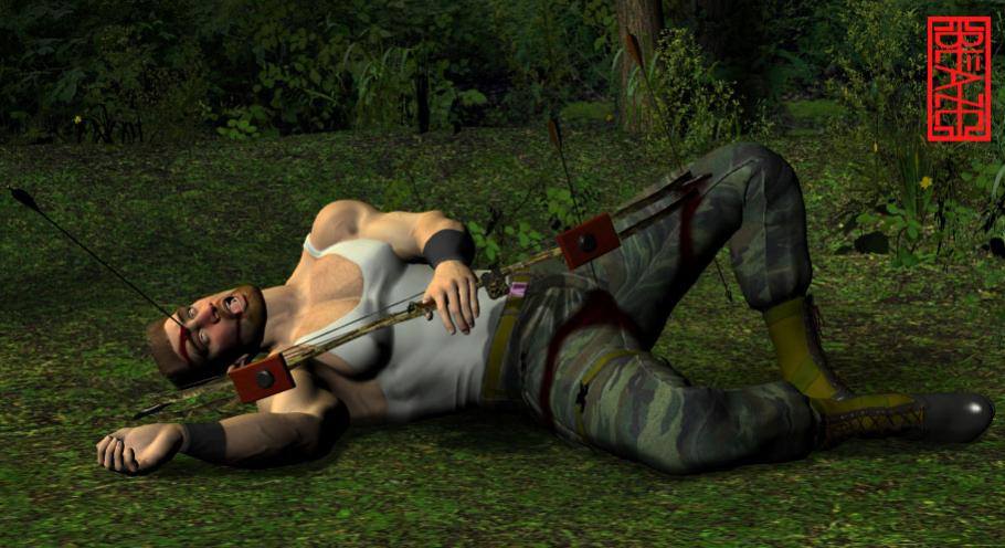Violent men hunt in a swamp, in brutal fist fights, two headed spear through the guts, strangulations, shooting bike cops in slow motion, heads smashed into a big ass tractor tire, a rooftop chase, fence smashing, a car crash, crossbow arrow through the neck bondage, crossbow arrow through the knee, a sword vs. tree branch fight, tree stump up through the chest, attempted drowning, a vicious back breaker, boot to the throat, testicle kicking, crossbow arrow to the chest, gut stabbing, a trophy room weapons brawl, spear throwing, a swordfight, stone spear through the chest!